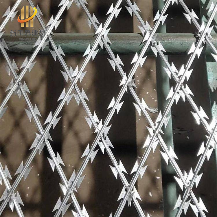 焊接的刀片刺网网片菱形状刺网,至于上下螺旋刀片刺高安全防护特性特性,刀片刺网和蛇腹网结合使用,使人望而却步,击破人的侥幸心理。刀片刺网由锐利尖角镀锌钢板或不锈钢薄板做刀片,钢丝做芯线组合而成的防护器。刀刺网的常用规格为:内丝2.5mm刀刺网有很好的隔离作用,防攀爬作用特别大。