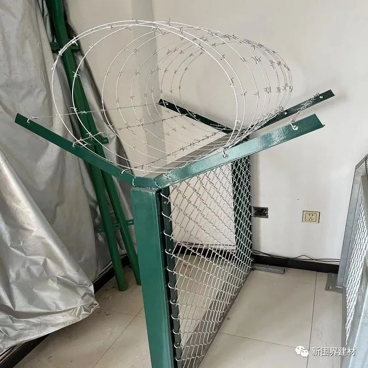 2、铝包钢丝菱形网采用冷拉低碳钢丝外径包裹铝层的防腐处理,网孔尺寸规格为55*55mm,直径3.2mm,铝包钢丝抗拉强度应达500MPa。立柱采用冷轧钢帶直缝焊接而成的矩形燕尾钢管并作内外防腐处理,要求钢带抗拉强度应达到375MPa,斜撑采用由热轧钢带直缝焊接而成的矩形钢管并作内外防腐处理,要求钢带抗拉强度应达到375MPa。延伸臂由热轧角钢焊接而成并做防腐处理,要求抗拉强度达到375MPa。铝包钢丝滚笼及铝包钢刺丝主丝直径为2.8mm的冷拉高碳钢丝,抗拉强度应达到1300MPa,刺丝为直径2.3mm的冷拉低碳钢丝,抗拉强度应达到5OOMPa,间距均为100-120mm。铅包钢丝滚笼与刺钢丝采用不锈钢扎丝连接,延长度方向每隔500mm设四个连接处。