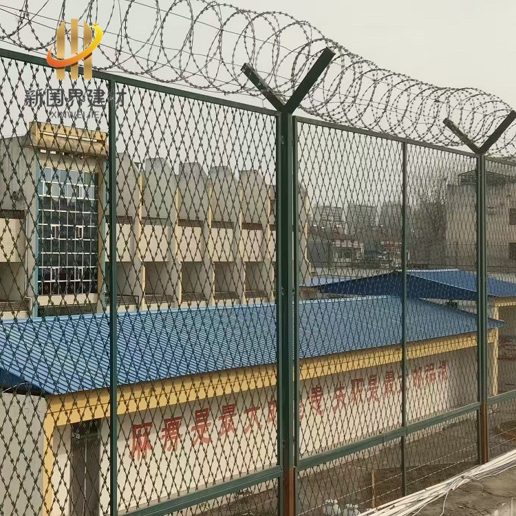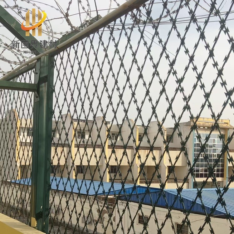 焊接刀片刺网菱形孔设计,刀片锋利且结构稳固,防护面积大。抗剪切、防腐蚀性很强,适配围墙、隔离带等,能有效防止攀爬和阻挡非法闯入。菱形孔刀片刺网通过钢板冲压成型,包覆在钢丝之上。其通过钢板冲压与镀锌处理,提高刺网的耐用性和威慑力。围栏顶部搭配蛇腹状刀刺网设计整体既美观又实用,大大提高了围栏的威慑力和防攀爬能力。