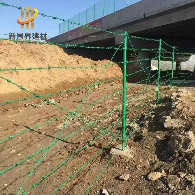 刺绳围栏是一种常用于安全防护和隔离的围栏类型,主要由金属丝或带刺的钢丝绳组成,具有较高的防护性能。刺绳围栏广泛应用于军事设施、监狱监区、机场、工业园区、农场、市政绿化等需要高安全级别的场所。其特点包括坚固耐用、安装简便、成本较低以及良好的视觉效果。刺绳围栏的表面处理通常包括镀锌、PVC/PE包塑等,以提高其耐腐蚀性和使用寿命。