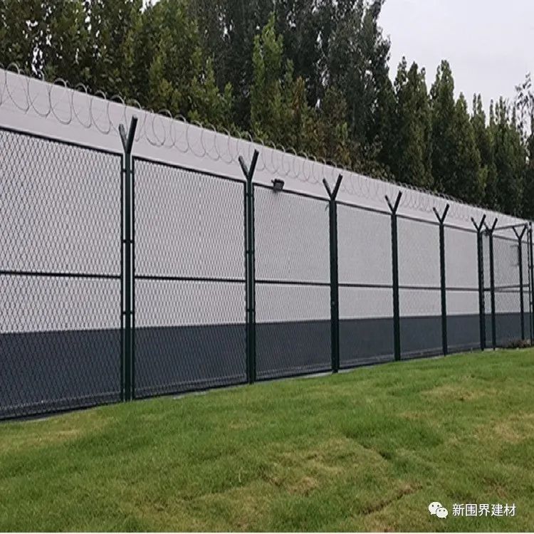 立柱焊接成Y型,表面浸塑处理,网片高度2000mm-3000mm,长度2500mm-3000mm,,V型顶端安装刀片刺网,直径采用50cm-60cm,刀片刺网主要是由热镀锌钢板或不锈钢薄板冲压而成的,它拥有尖锐的刀片,高张力镀锌钢丝或者不锈钢丝做芯线组合而成的产品。由于刺网的形状很特别,而且每个角度都有尖状刀片,因而能达到极好的防御保护效果。